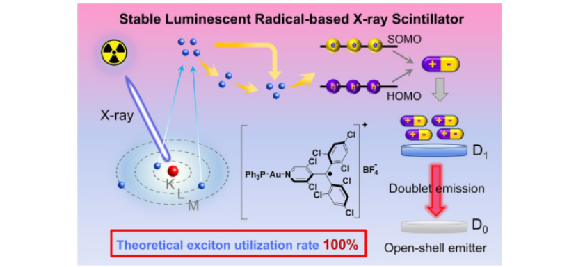 X-射線閃爍體在醫(yī)學(xué)成像、X-射線無損檢測(cè)、電子顯微鏡和高能粒子探測(cè)器等領(lǐng)域有著廣泛的應(yīng)用。高性能閃爍體是核醫(yī)學(xué)影像技術(shù)比如計(jì)算機(jī)斷層掃描(CT)、正電子發(fā)射計(jì)算機(jī)斷層掃描(PET)成像等檢查設(shè)備的核心部件。開發(fā)高X-射線激發(fā)發(fā)光效率的X-射線閃爍體是研究者們關(guān)注的焦點(diǎn)。近日,天健先進(jìn)生物醫(yī)學(xué)實(shí)驗(yàn)室臧雙全教授團(tuán)隊(duì)與香港中文大學(xué)(深圳)唐本忠院士團(tuán)隊(duì)合作,首次將開殼層發(fā)光體穩(wěn)定發(fā)光自由基引入高性能X-射線閃爍體的設(shè)計(jì)中,獨(dú)特的雙線態(tài)發(fā)射特性可以顯著提高輻射發(fā)光過程中的激子利用率,為高性能X-射線閃爍體的構(gòu)建提供了全新的策略。